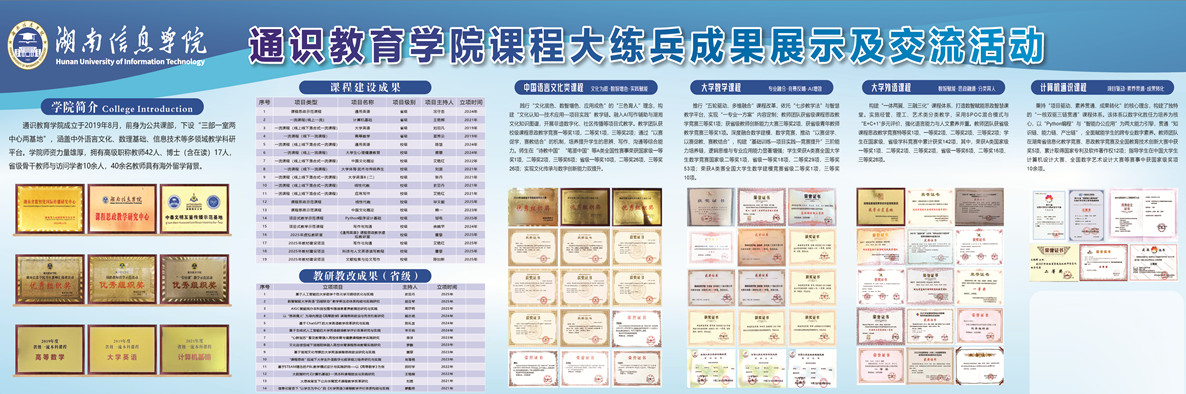 学院成功立项省级一流课程两门《大学英语》和《高等数学》,立项校级一流课程五门《线性代数A》《应用写作》《大学英语B》《武术和传统养生》《中国文化概论》。课程思政建设在湖南省创品牌,《通用英语》被认定为2024年湖南省课程思政示范课程,团队成员被认定为课程思政教学名师和教学团队,荣获全国外语课程思政教学竞赛一等奖2项,湖南省外语课程思政教学比赛特等奖1项、一等奖2项、二等奖1项、三等奖1项。其他教学赛事成果丰硕,荣获诗教中国诗词讲解大赛全国总决赛一等奖1项、二等奖1项,湖南省中华经典诵写讲大赛“诗教中国”诗词讲解大赛一等奖1项、二等奖1项、三等奖2项;荣获中国外语微课大赛国家级一等奖1项、二等奖3项、三等奖4项;荣获湖南省普通高等学校体育教师课程教学竞赛一等奖1项、二等奖1项、三等奖2项。